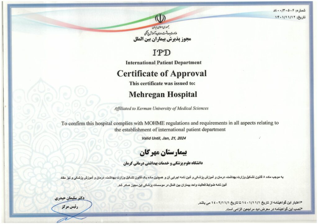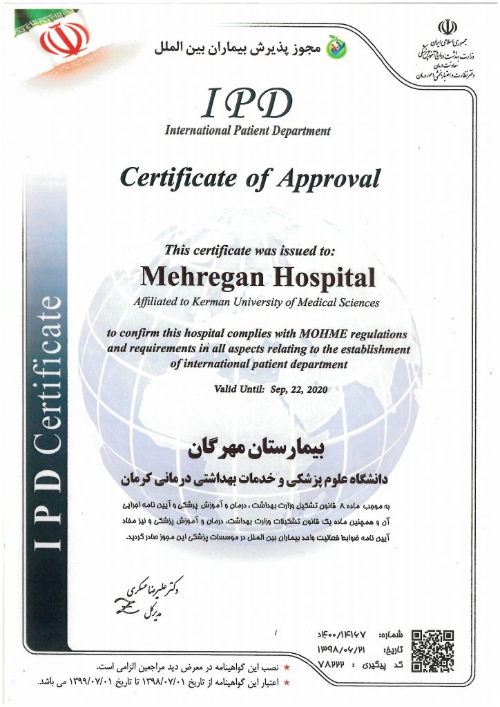 بیمارستان مهرگان موفق به کسب مجوزهای رسمی و گواهینامههای بینالمللی در جهت رعایت استانداردهای پزشکی جهانی شده است. بنابراین میتوانید با اطمینان و آرامش خاطر برای دریافت خدمات پزشکی و جراحی به این بیمارستان مراجعه کنید و علاوه بر بهرهمندی از زیباییها و جاذبههای دیدنی شهر کرمان، برنامه درمان خود را تکمیل نمایید.