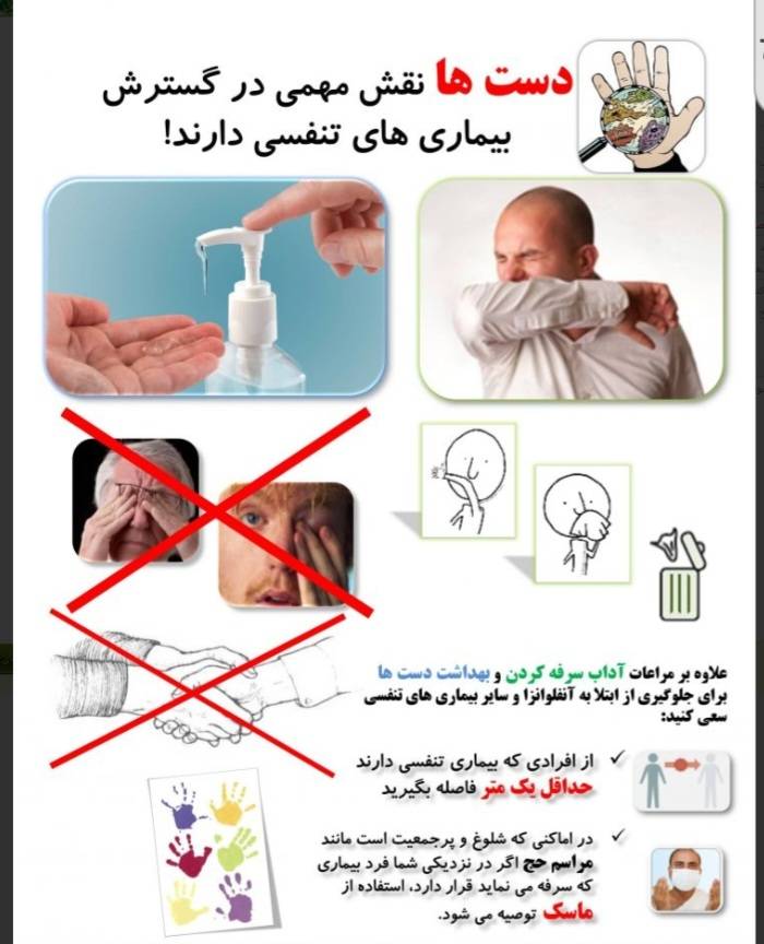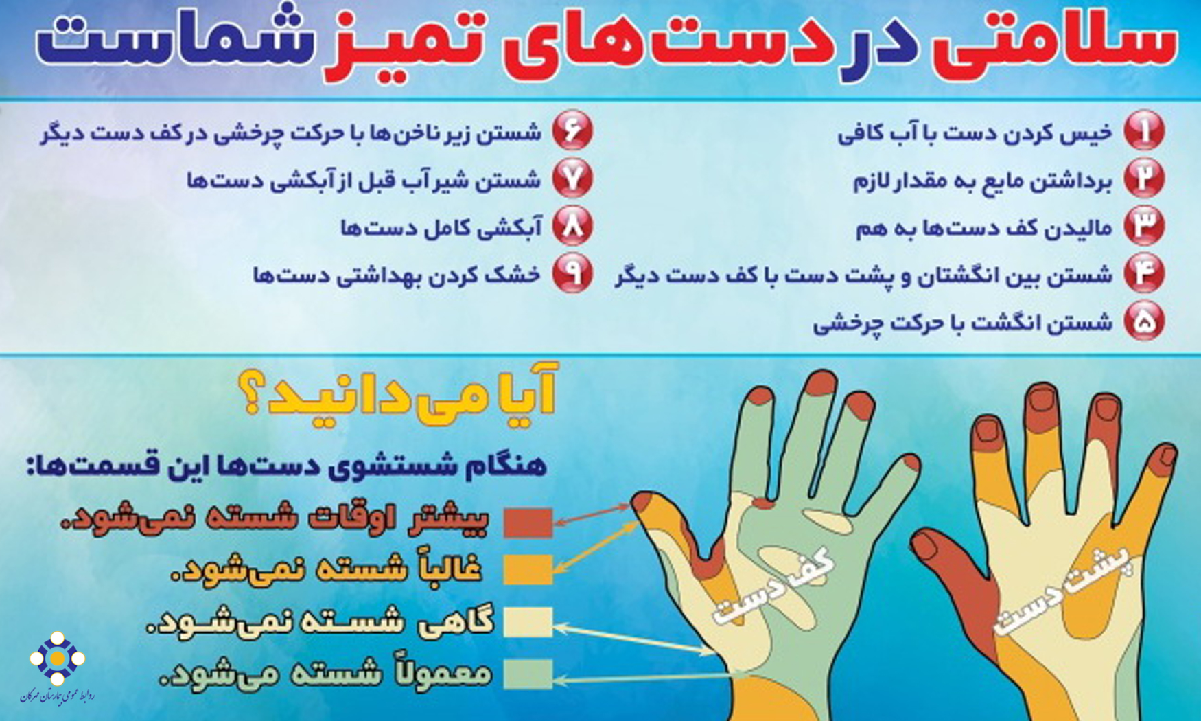 آموزش اجرای مراحل صحیح بهداشت دست با مستقر نمودن واحد بهداشت و کنترل عفونت و توزیع رایگان پک های بهداشتی